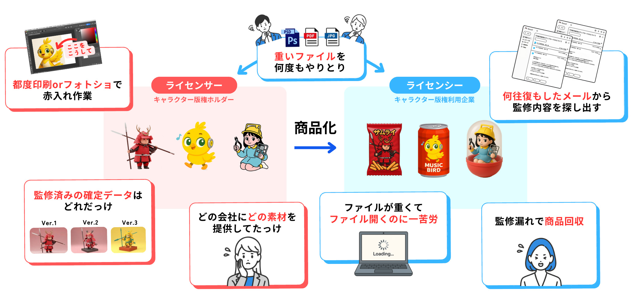 重いファイルのやり取り、煩雑な赤入れ作業、メールに埋もれる監修履歴。